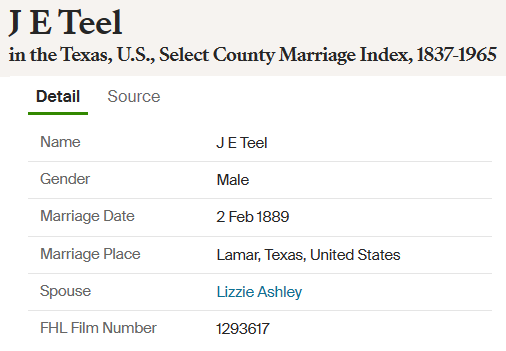 1889 Age 21 • Marriage • 02 Feb 1889 • Lamar, Texas, USA • Mary Elizabeth "Lizzie" Ashley • (1872–1920)
