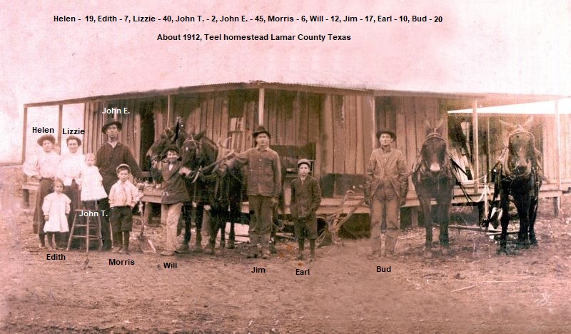 In 1910 John and family are still living on the farm in Lamar County. I believe the picture above was taken at about this time. Living at home in the Teel household are Mary E. (Elizabeth), Herbert (Bud) 18, Helen 16, James (Jim) 14, William J (Will) 9, Earl 8, Edith 5 and Morris 2.