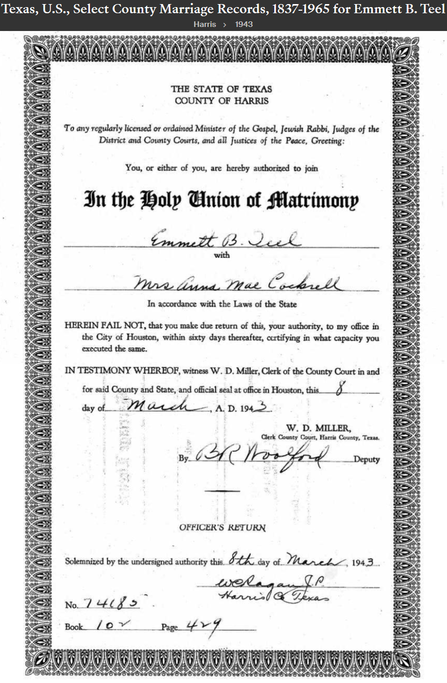 1943 Age 20 • Marriage • 8 Mar 1943 • Harris, Texas, USA • Anna Mae Teel Teel Sutton • (1923–2006)