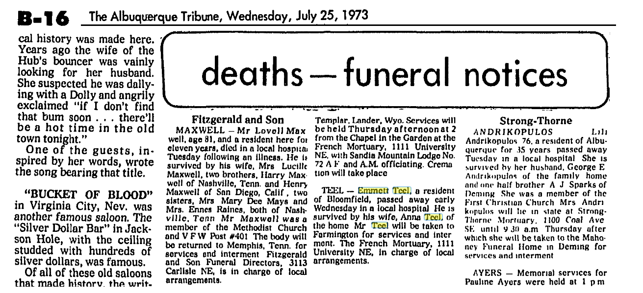 DEATH 25 JUL 1973 • Bloomfield, San Juan, New Mexico, USA